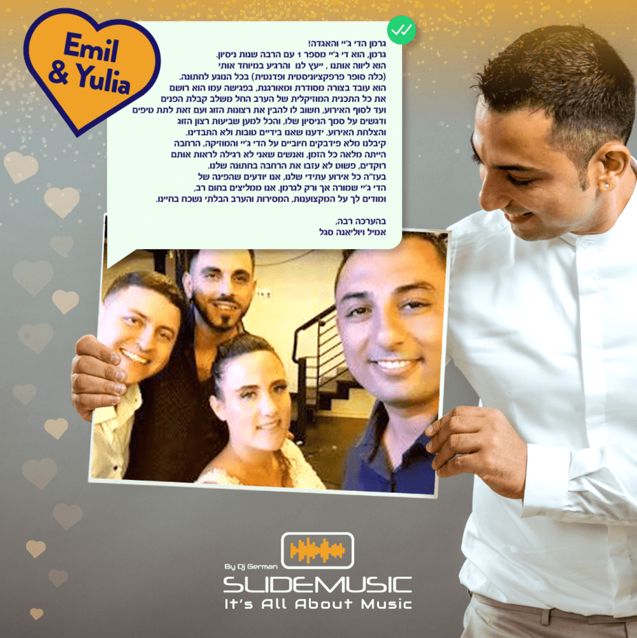 Главный ди-джей Slide Weddings – DJ German Avny. Мастер создания неповторимой атмосферы на празднике, с 15-ти летним опытом работы. Он умеет работать со стилями, смешивать и комбинировать современные мотивы с традиционной музыкой. Будь это новый популярный музыкальный стиль для танцев или тихая, спокойная музыка для ужина – DJ German Avny создаст уникальное настроение на вашем торжестве.